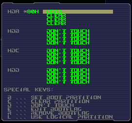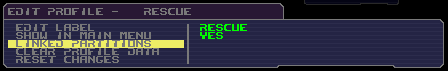 Now the menu is simple, we create the two profiles. Go to settings – profiles, select the first profile and press enter. Edit the label to something useful like “Windows XP”. To make sure Windows doesn’t see, the “rescue” partition, we need to go to “linked partitions”. Make sure the first partition is set to “boot partition”, this can be done by pressing “b”. Set the rest of the partitions to “clear”, this makes the partition(s) invisible to Windows.