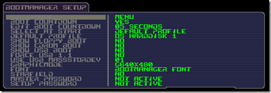 I usually make the menu plain and simple, so that there are only two options, the “default” which will start after a certain amount of time and the “rescue” option. Go to setup –> bootmanager and make the following settings.