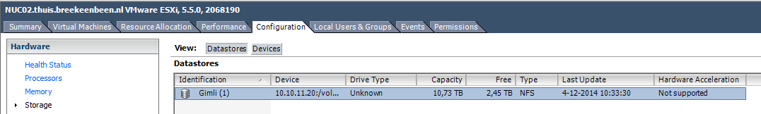 I was really trilled when Synology announced also releasing DSM 5.1 for their x10 series. Why? This because DSM 5.1 has a great feature called NFS for VAAI. In simple words, hardware acceleration on your NAS. For everyone using a Synology with at least DSM 5.1 or later and have VMware vSphere connected to it, I really would recommend enabling this feature. How you can do this, is explained below. First check your vSphere storage configuration, without VAAI you will see, that hardware acceleration is not supported.