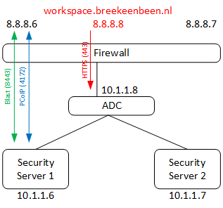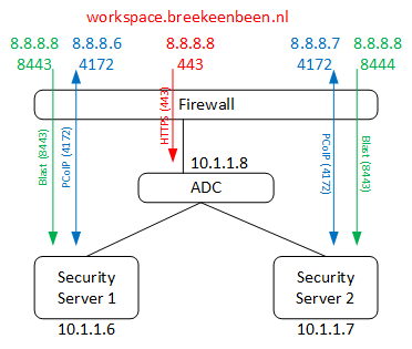 Although this is a perfectly working configuration, it has one caveat, when using Blast, it will redirect your browser to “https://8.8.8.6:8443”, this will result in an SSL warning, cause this IP is not the same as the certificates name “workspace.breekeenbeen.nl”. So what we want is, connecting to “ https://workspace.breekeenbeen.nl:8443”, this will result in a desktop through Blast without an SSL warning. However, we can use a public IP and port only once and we want also Blast to be spread over the two servers. Luckily we can easily do this by the use of Port-NAT, also called NAPT. Another benefit you gain by using NAPT is you really specify which ports to use, so this will more tighten the security. Especially watch the last line in the table below.
