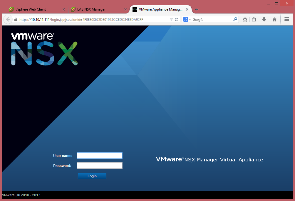 Power up the NSX manager and if everything went well, you will be able to visit the NSX page with a few minutes, https://IPAddress and you can log in with the username “admin” and the password specified during the deployment.