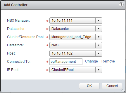 Go back to the “Management” tab of the “Installation” settings and click on the green plus sign, below NSX Controller Nodes. Fill in the following.