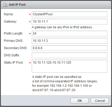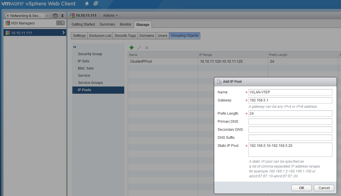 The last step in the preparation of the NSX environment is the VXLAN preparation, VXLAN is the tunnel protocol which makes sure every host participating in the NSX environment is able to communicate with each other. First we going to create an IP pool, with the IP adresses for the VMKernel adapters serving the VTEP (VXLan Tunnel End Point). Therefore click in the left bar on NSX Managers and select “10.10.11.111”, make sure the “Manage” tab is selected and click on “Grouping Objects”, select IP-Pools and click on the green plus sign. To show that communication between the hosts is really independent of the underlying network, I created a separate subnet without a default gateway (although specified).