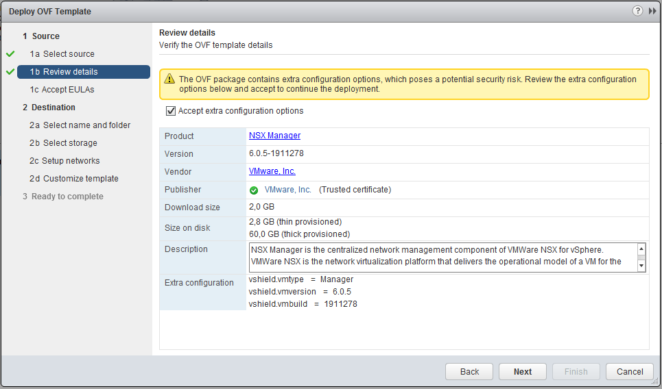 Finally we can start with some real NSX stuff. The first step is the installation of the NSX Manager. Go to hosts and clusters, right click the “Management & Edge” cluster and choose deploy OVF. Point to the NSX Manager OVA. Select Accept extra configuration options.