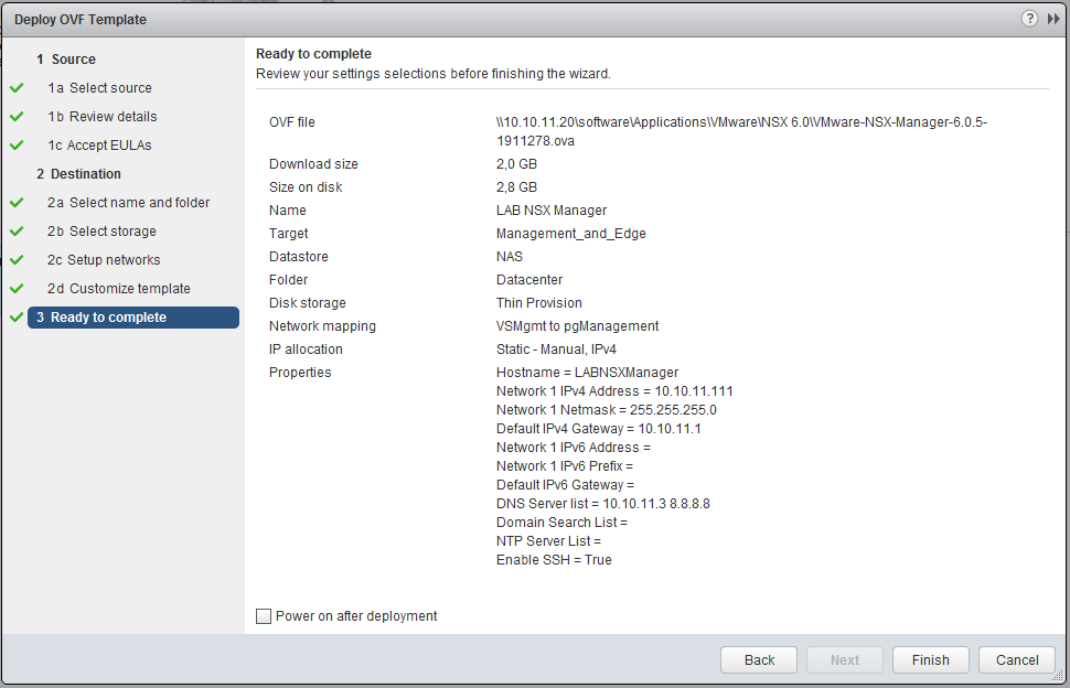 Read & accept the EULA, pick a name (i.e. LAB NSX Manager). At the Network setup make sure you choose the new “pgManagement” port-group. At the “Customize template”, set some passwords and make the network configuration.