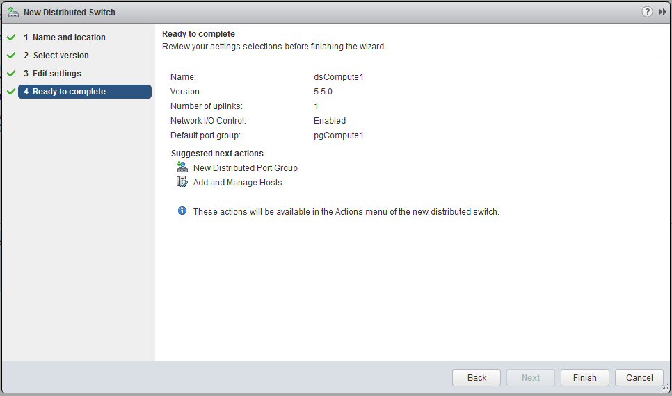 Since the NSX vSwitch is based on the “distributed switch”, this is what we are going to create first on the two clusters. We will make two distributed switches, named;