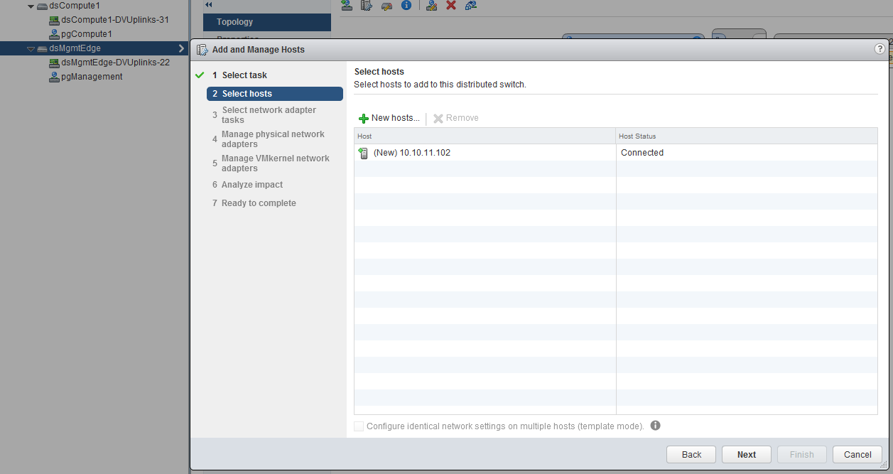 Now we have created the distributed switch and configured the port-group, we need to add the hosts to it. Right click on the distributed switch and click on “Add and Manage Hosts”, we want to add the host, select the appropriate host.