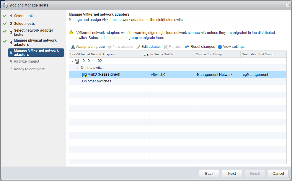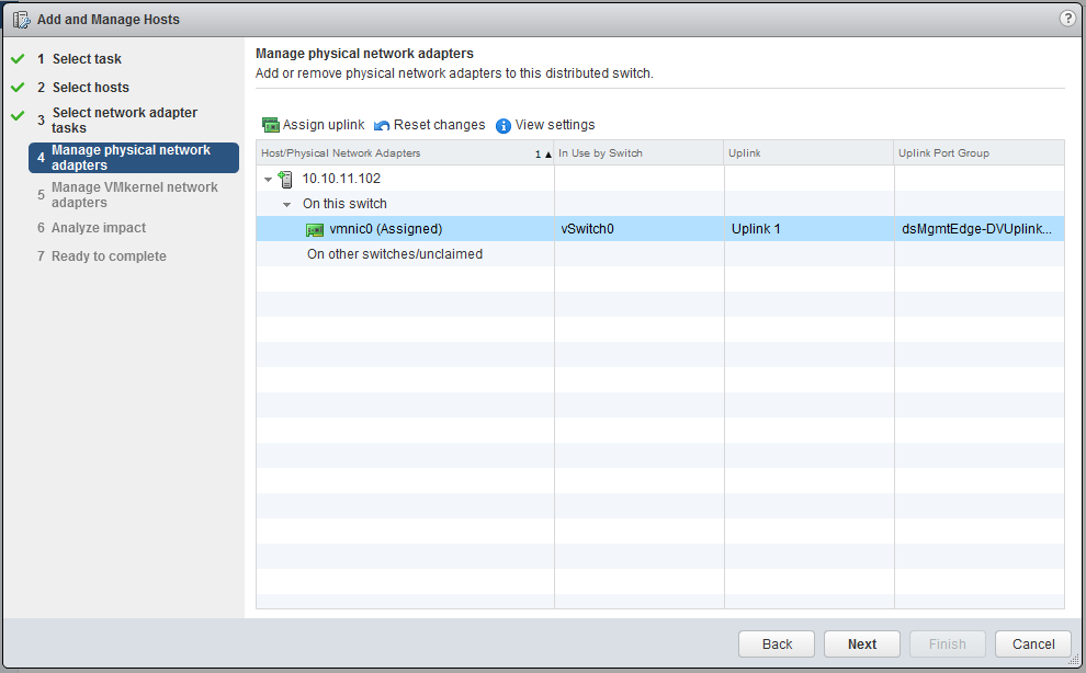 Make sure both the “Manage physical adapters” and “Manage VMkernel adapters” are both checked. We will move the vmnic0 to the uplink of the distributed switch.