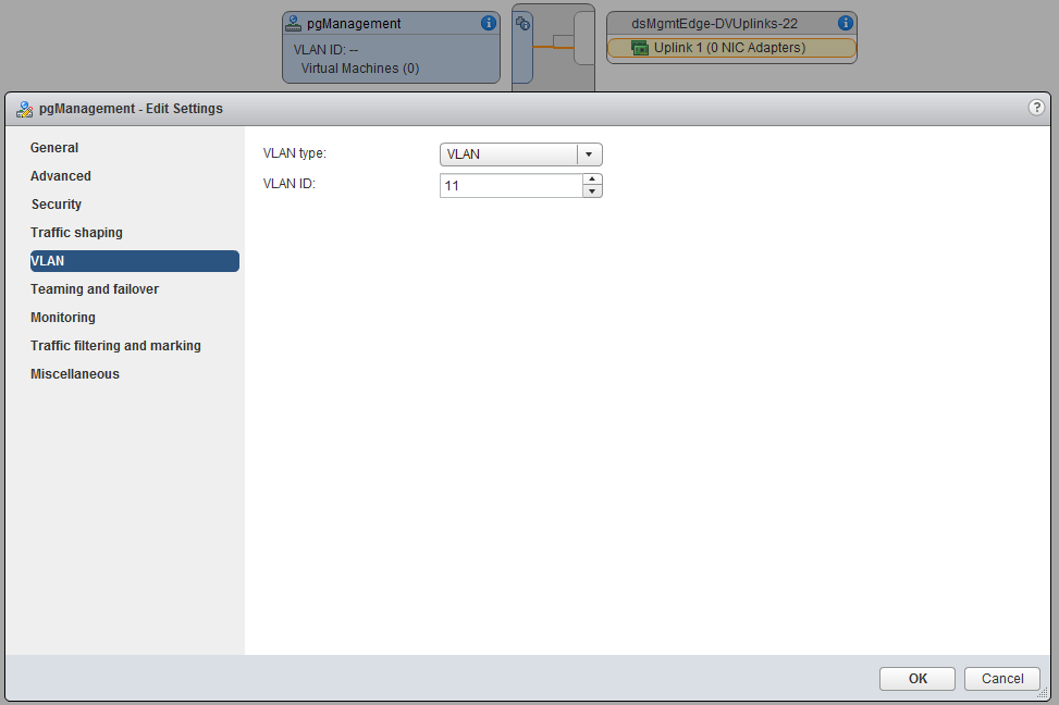 Before we can actually add hosts to the distributed switches we created, we need to add the VLAN tag to the newly created port-groups. Therefore select the distributed switch, choose the manage tab and make sure settings is selected. Select the port-group and click edit settings. Under the VLAN settings, choose VLAN and enter the appropriate VLAN ID. (if you don’t work with VLANs you can skip this step)