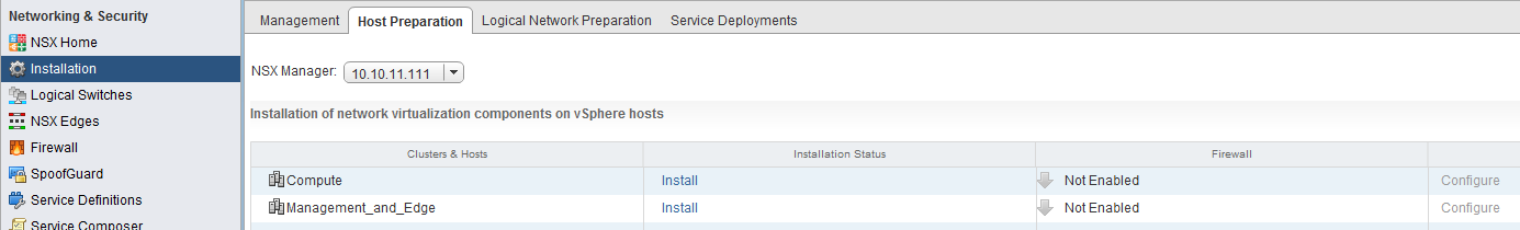 Click on the new “Networking & Security” option and go to “installation”, click the “host preparation” tab. It will show the clusters available within the vCenter.