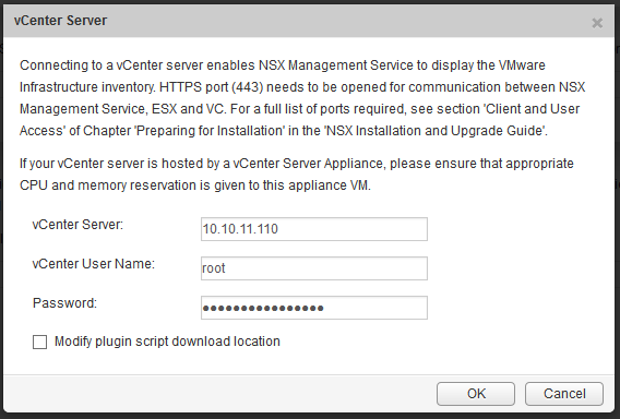 NSX has a tight integration with vCenter, at this moment it is an 1 on 1 relationship, which means for every vCenter, you need one NSX Manager. Log in to your just deployed NSX Manager and click on “Manage vCenter registration”, click on edit and enter your vCenter information.