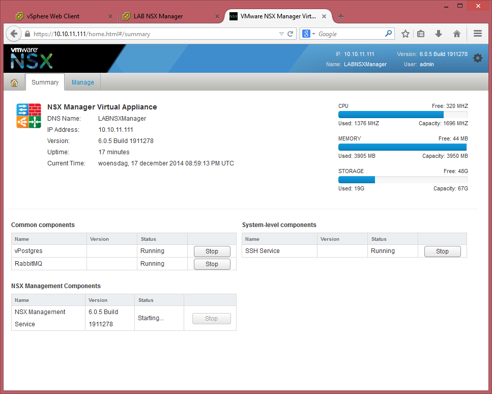 Before we continue, I noticed that the resources are a bit short, cause after 17 minutes, the NSX Mangement Services wasn’t started and it would eventually turn out to take 19 minutes. As you can see the Memory is in full use and also on the ESXi host we can see this, this is an indication that we need to increase the memory of the ESX02 (the host of the Management & Edge) cluster. Cause it is also going to run the NSX Controller(s). Luckily this is a virtual ESX host, so extending the memory is quite easy, I doubled it at this moment to 8GB. I didn’t increase the memory of the NSX Manager, since this is a LAB, I don’t care if the start-up takes a while, as long it will run fluent enough to do some testing.