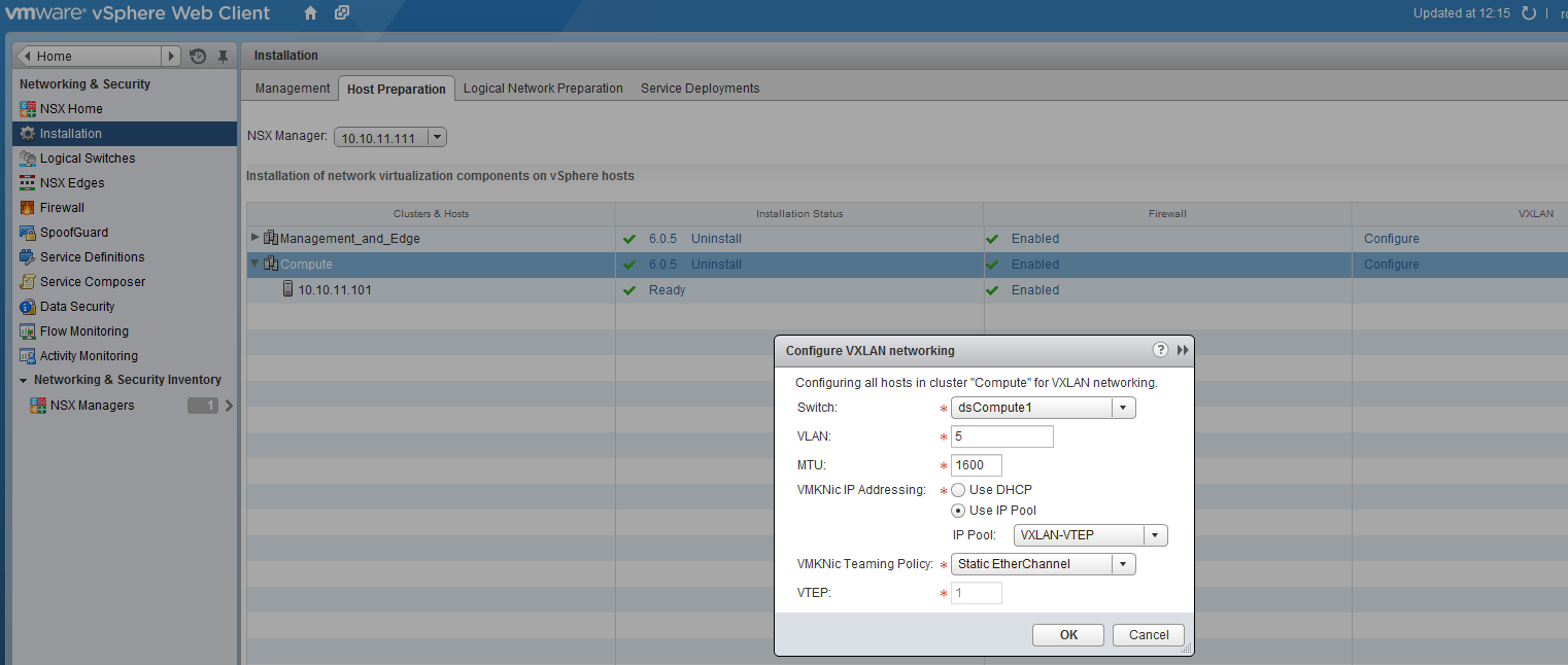Now go back to the installation, “Host Preparation” tab and in the column VXLAN click “configure”.