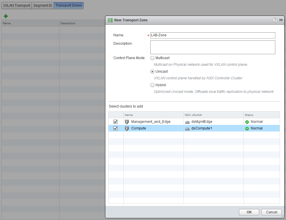 The last part is to create a “Transport Zone”, this will tell NSX which clusters are able to communicate with each other. Click on “Transport Zones” and click the green plus sign.
