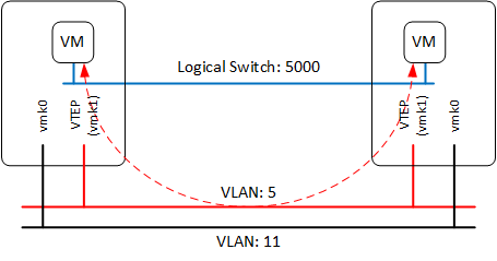 As you can see in the mac-table, there is a relationship between the MAC address and the VTEP-IP. What it actually says is that if App-VM1 sends something to App-VM2, the traffic will be encapsulated (VXLAN-header), with the destination IP (192.168.5.11) of the VTEP connected to the host running the VM. After the host received the traffic, it is being decapsulated and sent to the VM, so the VM’s don’t know anything about how the traffic is handled and won’t see any difference between a virtualized or a traditional network.