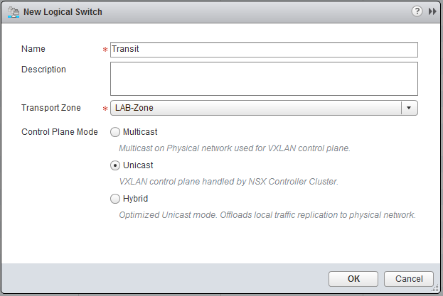 Best practice is that we use an Edge Services Gateway (ESG) for connection with the outside world. This means that the Logical Router will forward the traffic to the ESG and the ESG will route the traffic to the physical world. This is just one of the many functions the ESG can do, it can also NAT, Loadbalancing, basic firewalling, etc. VMware likes to call it a “swiss army knife” due the roles it can fulfill. Between the Logical Router and the ESG we will have a so called transit network, for this create a new Logical Switch and name it Transit.