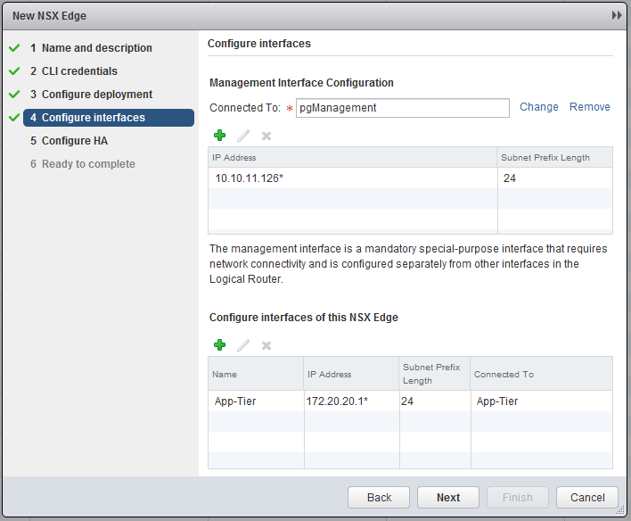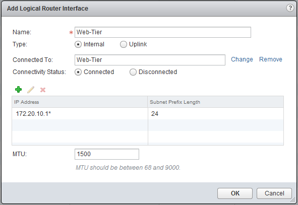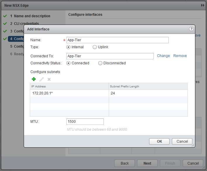 Add an interface and connect it to the “Logical Switch” - “App-Tier” and specify an interface, in this case 172.20.20.1 [!
