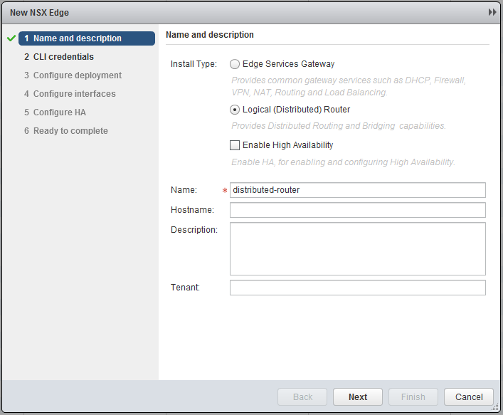 Another neat feature of NSX is the distributed router, this not only means you can route traffic, but the neat thing about it is, that this can be done on “host”-level. This means that when two VMs are running on the same host, but in different subnets, the distributed router (remember installed VIB) will route the traffic in the kernel, so the traffic won’t have to leave the host! To create a distributed router, go to “Network & Security” and click on “NSX Edges”. (If you ask me, they should make two categories, “NSX Edges” & “Logical Routing”, this would make a in my opinion lot more sense) Click the green plus sign and select logical distributed router.