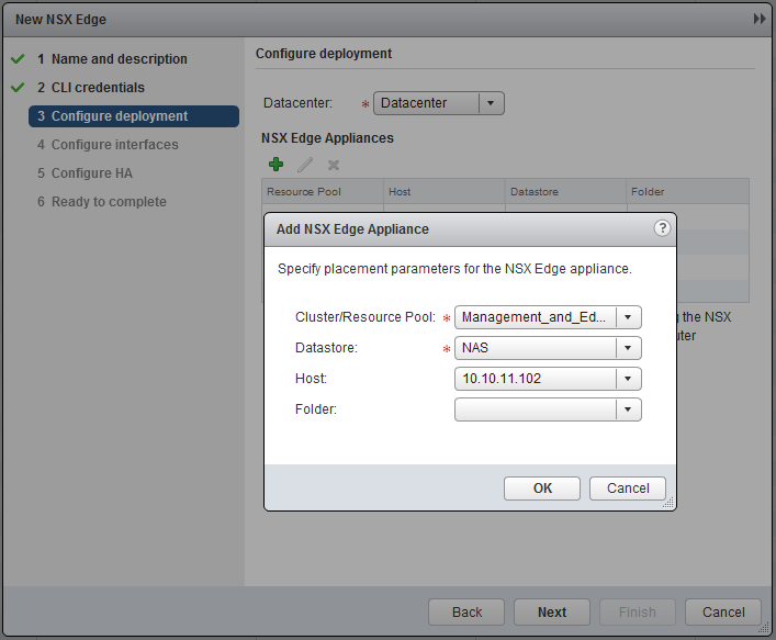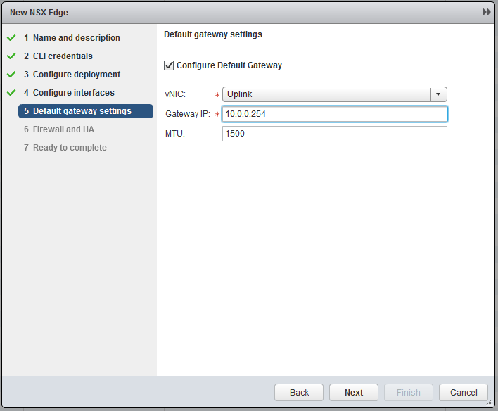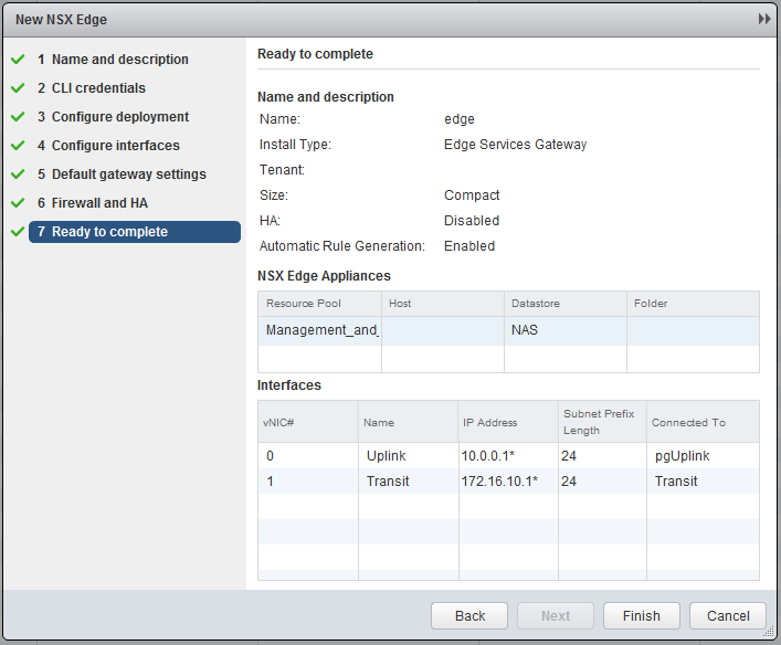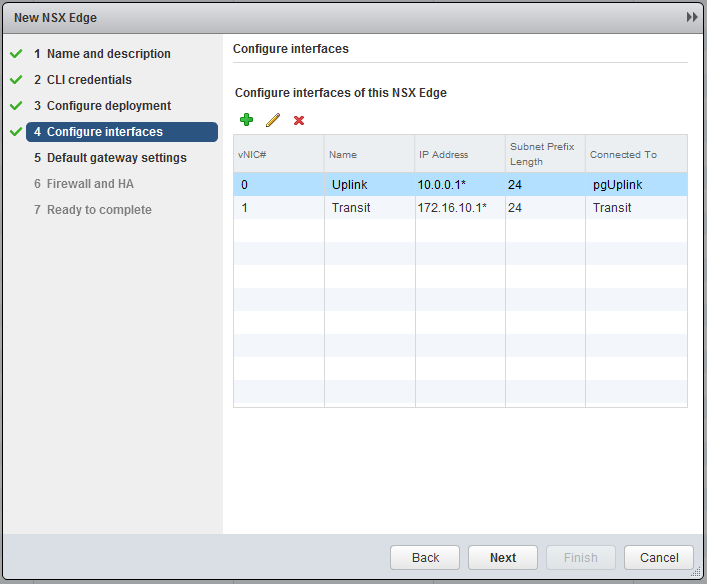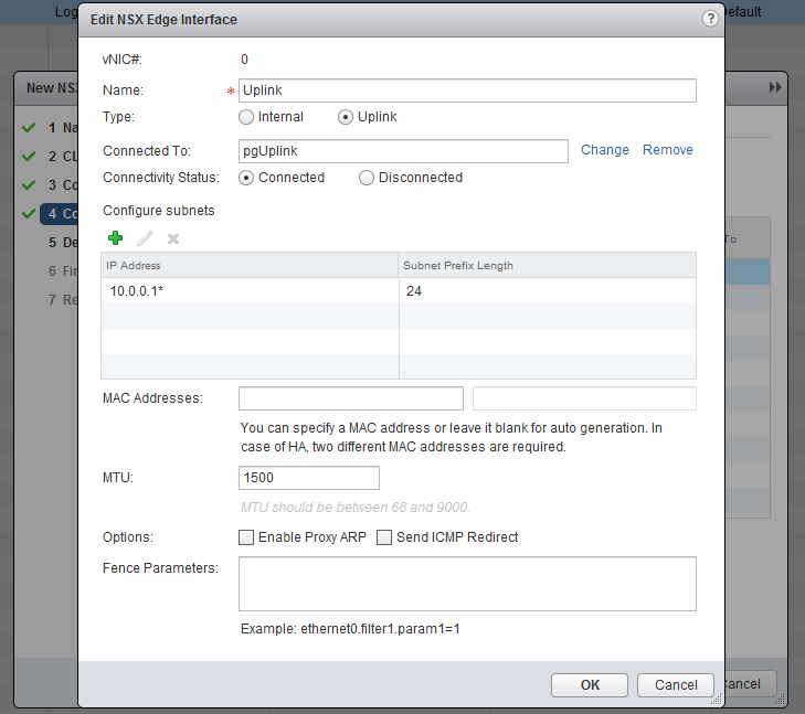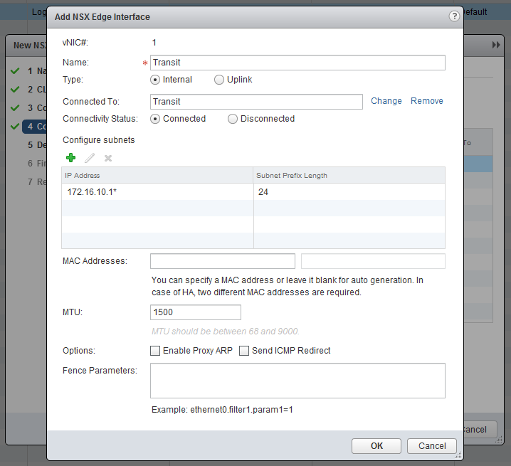 Now the most important part, create the interfaces. Chooste “internally” for the Transit. I will use 172.16.10.0/24 as transit subnet and the Edge will get .1 and the Logical Router (later on) .2. In the Uplink subnet I have 10.0.0.0/24 and will use 10.0.0.1 for the Edge. My physical router has 10.0.0.254, so this will become my default gateway.