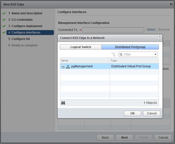My uplink is in a different VLAN, so I created a new portgroup pgUplink, but if your network is flat or you want to (mis)use the management port-group, this is no problem. Make sure, when you create an additional port-group, do this at the Management and Edge (cluster) Distributed Switch.