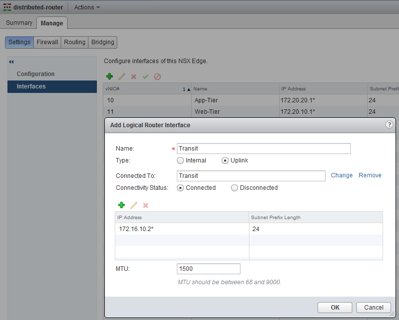 Since we didn’t connect the distributed router to the Web-Tier Logical Switch, there is no gateway and no communication possible between the App- & the Web-Tier. The App-Tier is connected and you can try ping the gateway 172.20.20.1 from one of the App-VMs, this should work. Go back to NSX Edges en open the distributed router we created, select the Manage tab, click on Settings and select interfaces. Now click the green plus sign and add the Web-Tier and create an interface with IP 172.20.10.1.