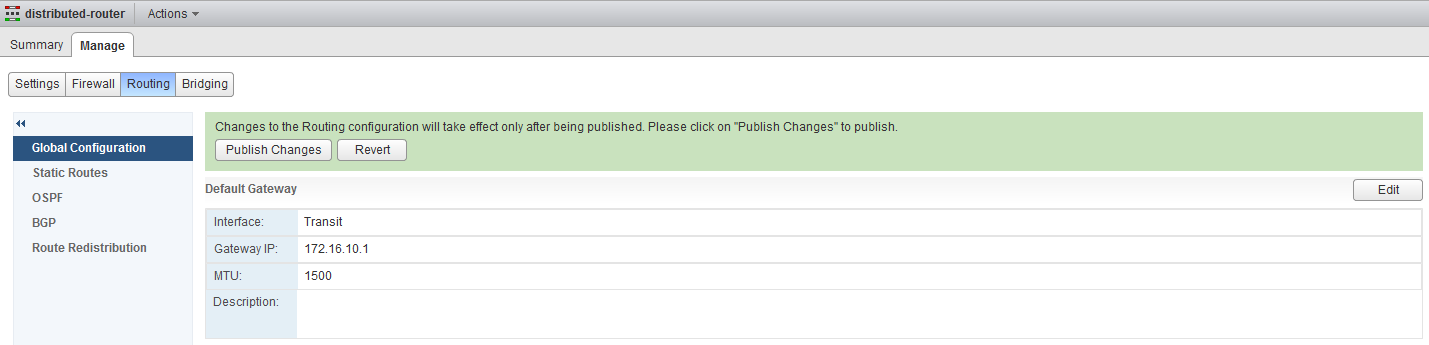 Go to routing and set the default gateway under Global Configuration to the ESG, make sure to Publish Changes when you are done.
