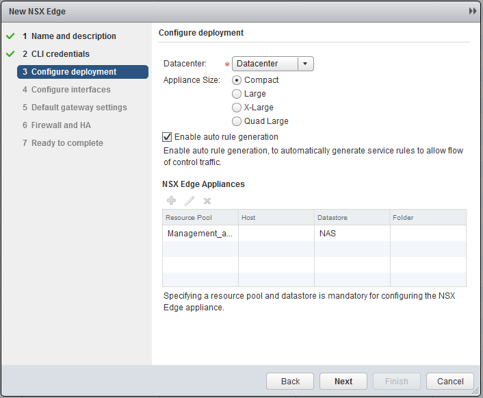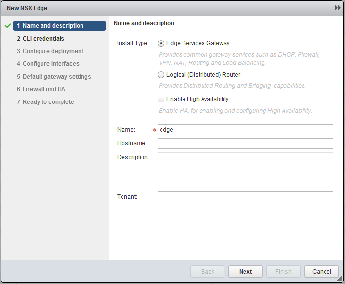 Go back to the NSX Edges and click the green plus sign, similar to the deployment of a Logical Router, however now we choose Edge Services Gateway.