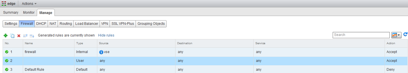 Now the very last step is to check the firewall of the ESG, by default it only has a rule which accept traffic, which has a source VSE (I assume this stands for vShield Edge). For this lab we will add a rule, which allows any traffic. Go to the ESG and click on firewalling and click the green plus sign. It will by default create a rule which accepts any, any, any :). Don’t forget to publish the new rule.