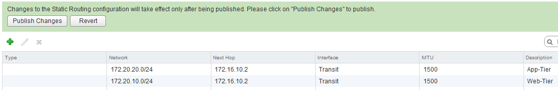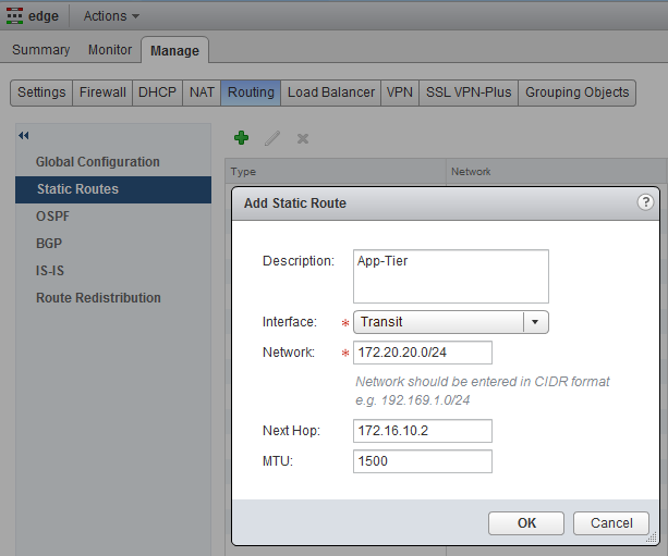 Now open the just deployed ESG and go Manage, Routing, (for now) we will create static routes to the Logical Router we created earlier. Add the following two routes for the App and Web tier, by clicking on the green plus sign.