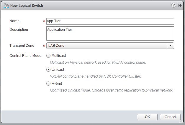 If not already, go to “Network & Security” and click on “Logical Switches”, click the green plus sign, to add a Logical Switch. I used the following settings: