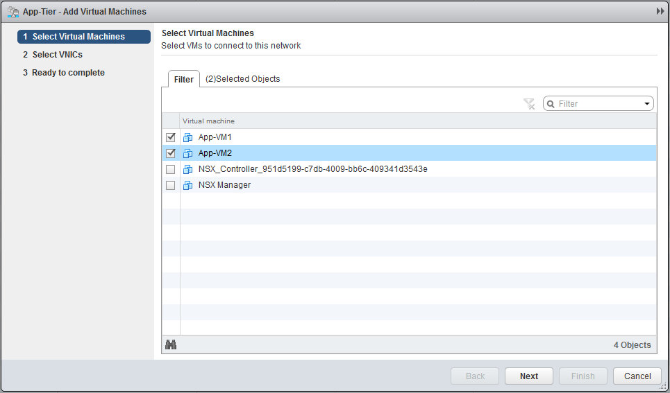 When both VMs are deployed, go to “Logical Switches” and click on “Add VM”, select the two VMs, select both the NICs and finish the task.