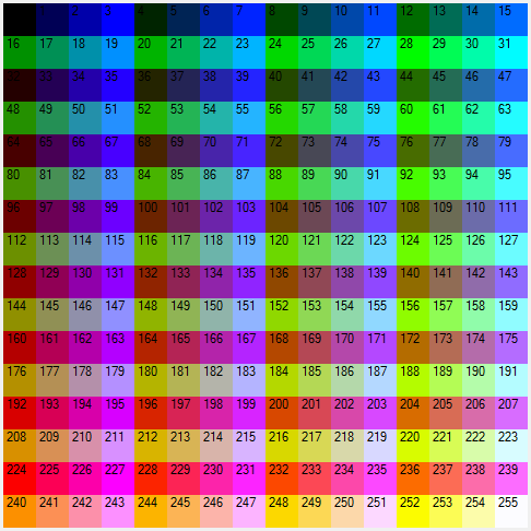 So I build a small C# program that creates a 8bit color map. Below you find the result and even the source, but don’t shoot me on the code :-)